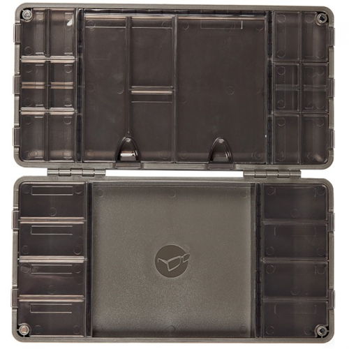 片側にはフックリンクのスプール、プラーリグツールズ、ハサミなどややかさばる小物を、同じ面の半分、8個のコンパートメントは押し上げ蓋方式、中身が溢れるのを防ぎます➖ヘリ セーフティビーズ、ハイブリッド レッド クリップス、イミテーションベイトなど収納に最適